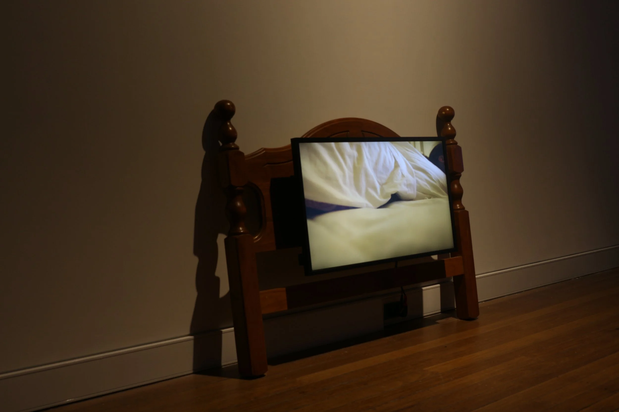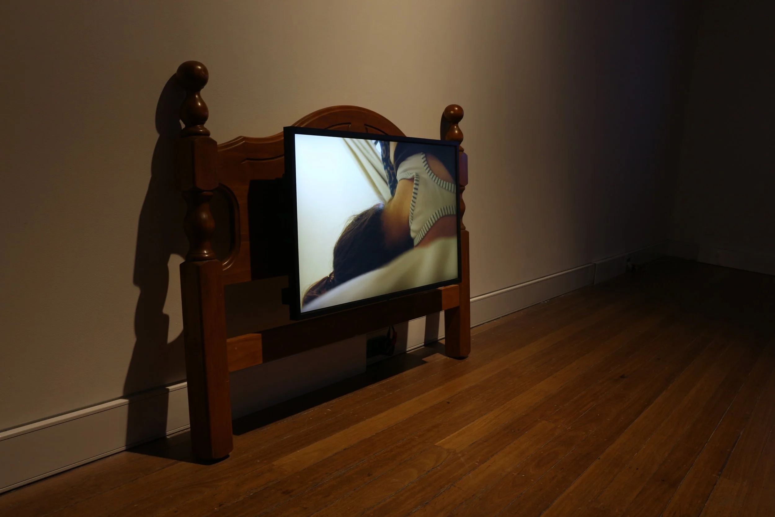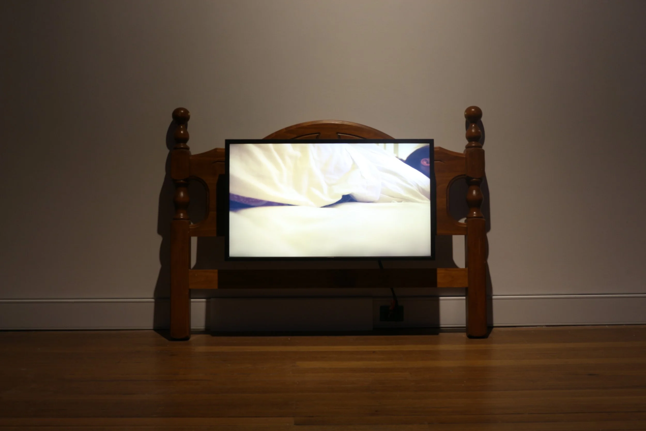 single channel video with sound, queen-sized pine headboard, duration: 00h:11m:37s looped